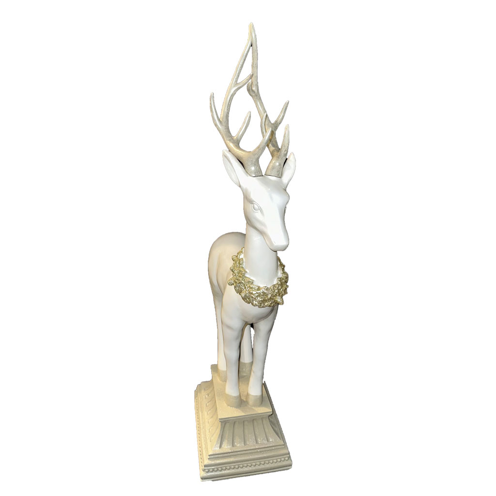 Make your event truly magical with our enchanting 4ft White Reindeer statue! Standing tall on a golden base and adorned with a shimmering gold collar and twinkling LED lights, this elegant reindeer is the perfect centerpiece for holiday parties, winter weddings, or any festive occasion.