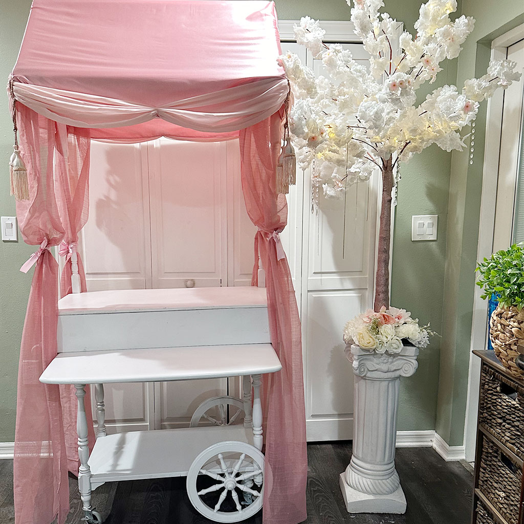 Step into sweetness with our charming white sweet cart, complete with a delightful pink canopy. Its pristine white frame contrasts beautifully with the soft pink canopy, creating a picture-perfect centerpiece that will wow your guests. Imagine it brimming with colorful candies, desserts, or even as a cake stand, all displayed in an irresistibly charming setup. Rent this sweet cart and turn any occasion into a memorable, Instagram-worthy event!